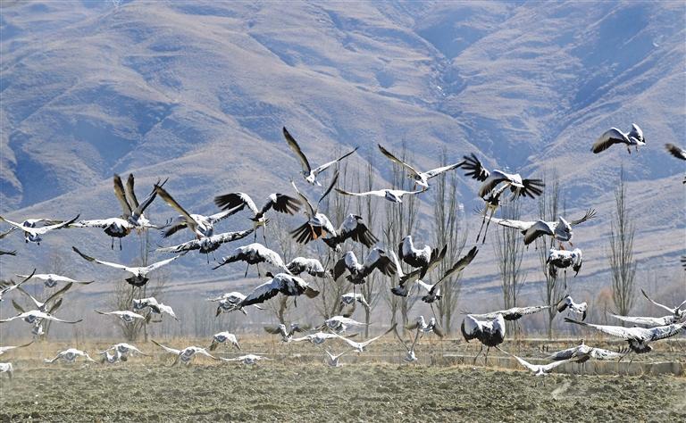 冬日的山南,又一次迎來了一群特殊的客人——黑頸鶴。成群的黑頸鶴在田野悠閑地覓食、嬉戲,給冬季增添了生機和活力,呈現出一幅人與自然和諧相處的絕美畫卷?! ?/p>