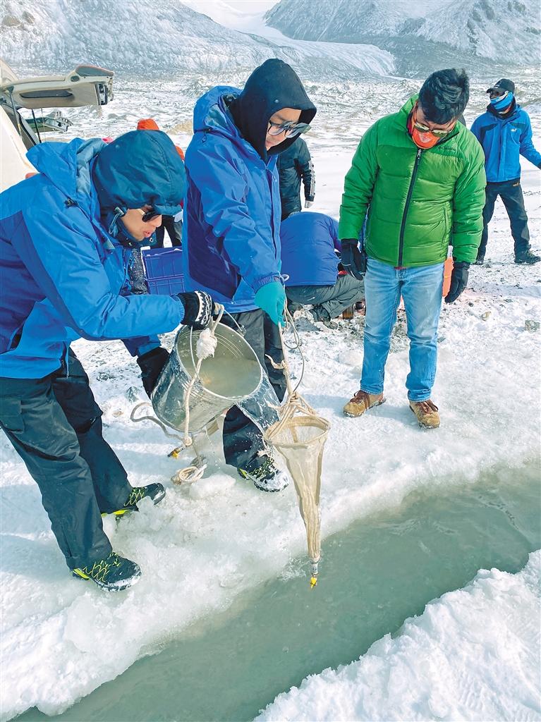 為全面系統(tǒng)摸清水質(zhì)狀況,監(jiān)測(cè)組在崗加曲巴冰川末端融水河流斷面開(kāi)展了水溫、電導(dǎo)率、溶解氧、PH值的現(xiàn)場(chǎng)監(jiān)測(cè),同時(shí)開(kāi)展了微塑料、抗生素等指標(biāo)的全分析及生態(tài)監(jiān)測(cè)的采樣工作。