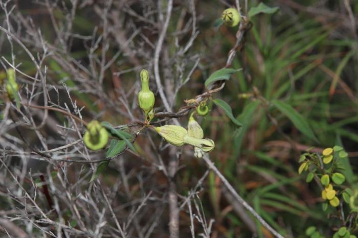 綠汁江吊燈花形態(tài)上與匙冠吊燈花近似,但該種花梗較長且疏被柔毛,花冠筒上部的直徑僅為下部的一半,花冠裂片內(nèi)部密被白色長柔毛,外輪副花冠裂片具2齒,這些特征可與其近似種明顯區(qū)別。目前,科研人員僅在易門縣綠汁鎮(zhèn)后山坡發(fā)現(xiàn)一個(gè)居群,零星的分布在干熱河谷稀樹灌草叢中,生境受人為干擾較為嚴(yán)重,根據(jù)IUCN的評(píng)估標(biāo)準(zhǔn)將其瀕危等級(jí)評(píng)估為極危。