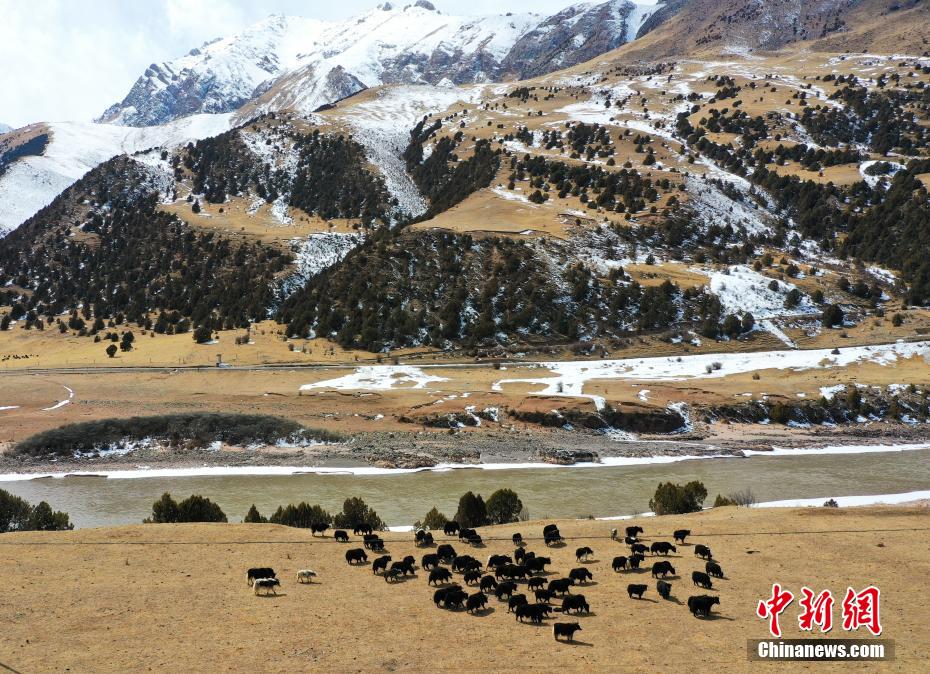 2月27日,一場降雪為青海省玉樹藏族自治州三江源國家公園瀾滄江源園區披上銀裝,藍天白云,雪山江河,牦牛在金燦燦的高山草場上悠閑散步,形成一幅幅多彩的生態美景圖。馬銘言 攝