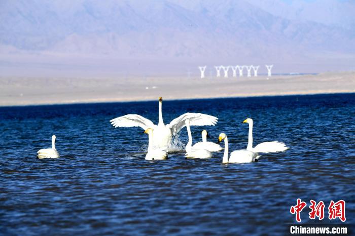 圖為天鵝群在湖中游蕩。 青海多美生態環保科技有限公司 供圖