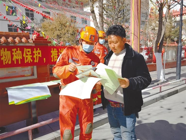 昌都市森林消防支隊邊壩縣駐防分隊隊員為群眾講解野生動植物保護宣傳手冊內容。 記者 桑鄧旺姆 攝