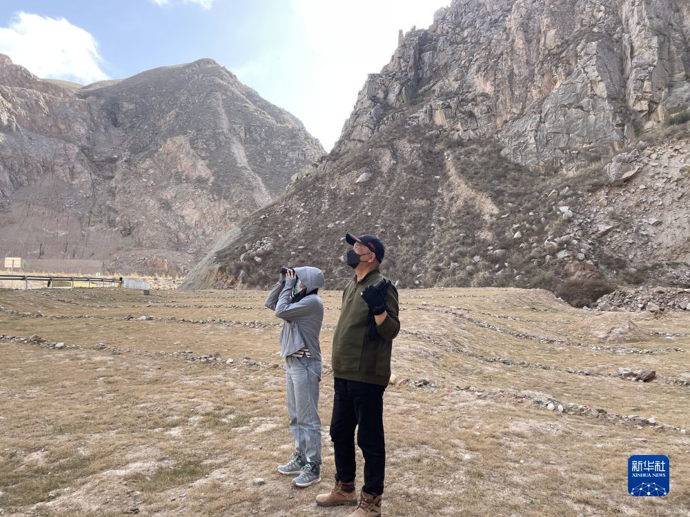 4月9日,在青海省海東市平安區,王艦艇(右)觀察遠處的黑鸛。 新華社記者 耿輝凰 攝