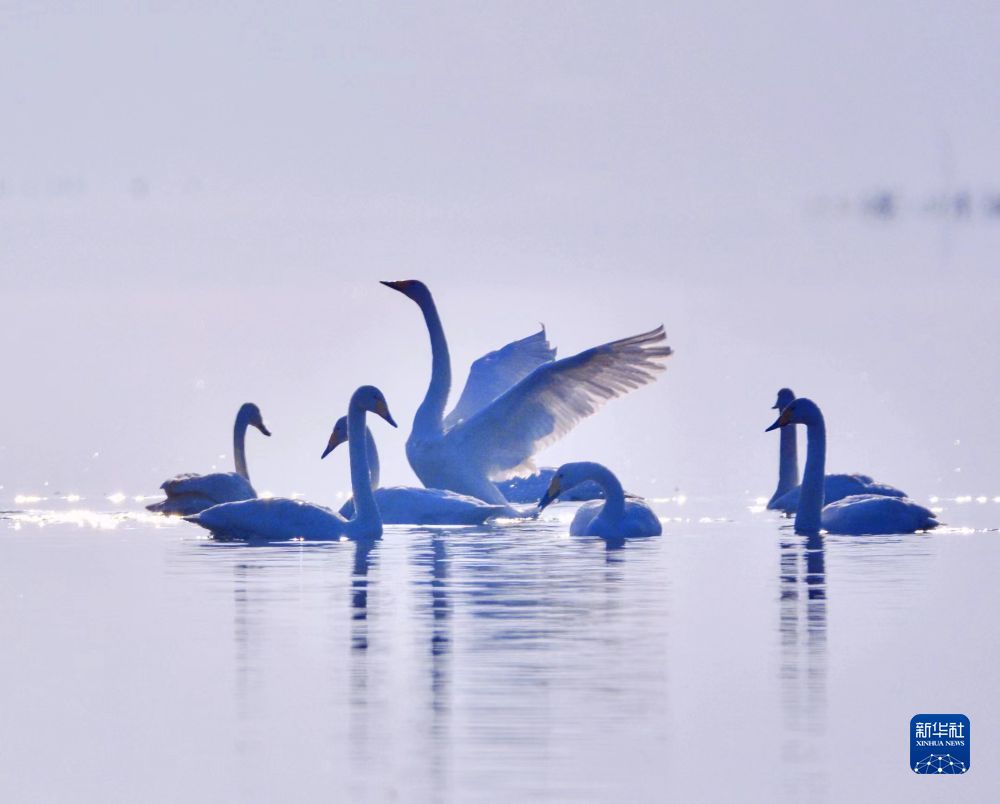 2021年11月23日在青海省海東市化隆回族自治縣境內的黃河濕地拍攝的大天鵝。新華社發 李玉峰 攝