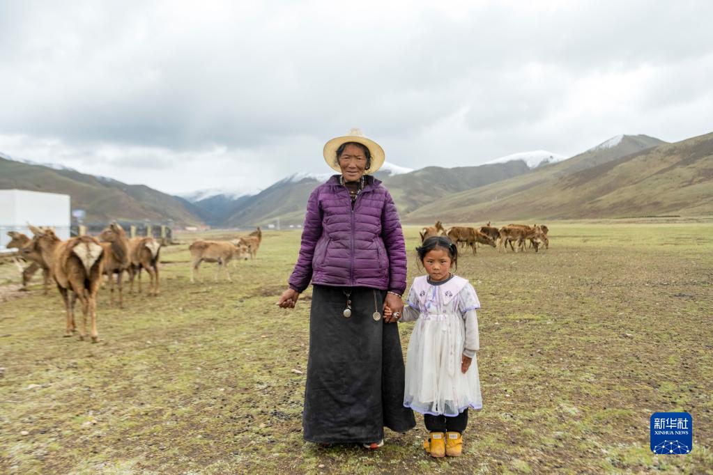 向秋拉姆和孫女在類烏齊馬鹿國家級自然保護區內合影(5月21日攝)。新華社記者 周荻瀟 攝