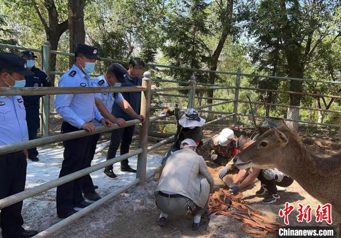 圖為青海省野生動物救助中心工作人員對白唇鹿進行檢查。 尖扎縣公安局供圖