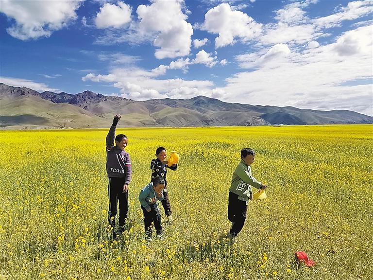 在那曲市色尼區羅瑪鎮凱瑪村,有一片由油菜花和披堿草共同構成的草場。盛夏時節,七千畝的油菜花競相盛開,成為碧綠羌塘草原上一片金燦燦的風景。