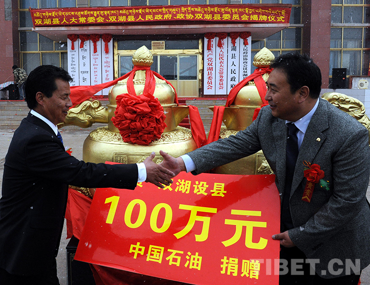 這是對口援助單位的中國石油為雙湖設縣捐贈100萬元。經國務院批準,2013年7月26日,雙湖特別區“撤區建縣”正式掛牌(唐召明2013年7月26日攝)