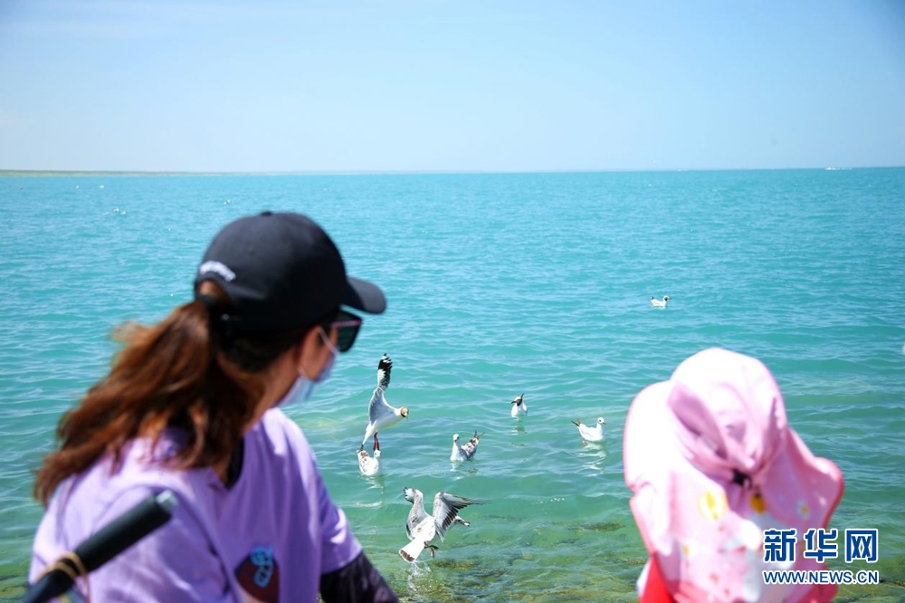 8月8日,游客在青海湖畔觀鳥賞魚。新華網(wǎng) 馬洪婷 攝