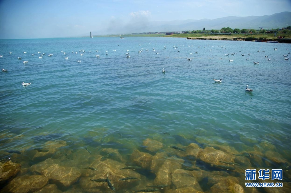 水面上,棕頭鷗隨波蕩漾;湖水里,青海湖裸鯉悠閑游弋。新華網(wǎng) 馬洪婷 攝