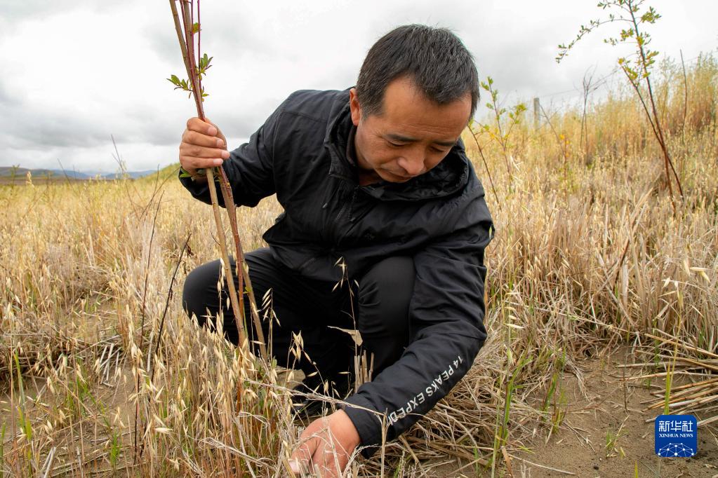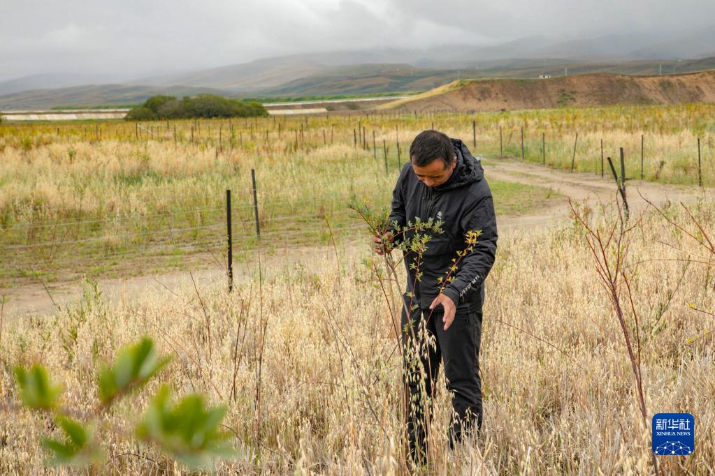 瑪曲縣自然資源局高級工程師馬建云在黃河瑪曲段干流沿岸一處阻沙林帶建設區域觀察植被生長情況(9月16日攝)。新華社記者 郎兵兵 攝