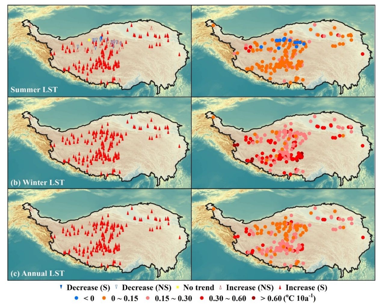 基于重建的湖面溫度時間序列,團隊揭示了青藏高原湖面溫度的時空演化規律。研究發現,近40年來(1978—2017年)青藏高原絕大多數湖泊的表面溫度均呈上升趨勢,升溫速率約每10年0.01~0.47℃,且冬季升溫比夏季更顯著,南部湖泊升溫速率高于北部湖泊。此項研究成果對于未來進一步評估氣候變化對青藏高原湖泊水熱收支變化的影響具有重要價值。