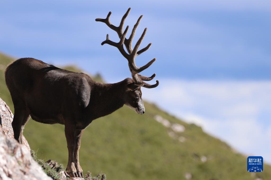 這是在青海省玉樹藏族自治州雜多縣境內的昂賽大峽谷拍攝的白唇鹿(8月5日攝)。新華社發(達杰朋措 攝)