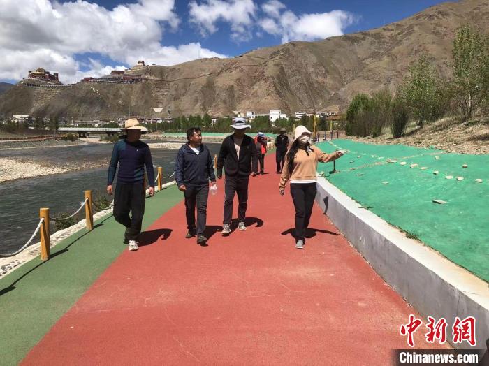 圖為寧樣(右一)檢查玉樹市樹木生長情況。 玉樹市委宣傳部供圖