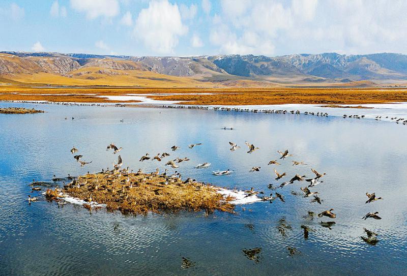 雪后陽光下,數千只飛禽在若爾蓋花湖嬉戲翱翔。 四川日報全媒體記者 尹鋼 攝(資料圖片)