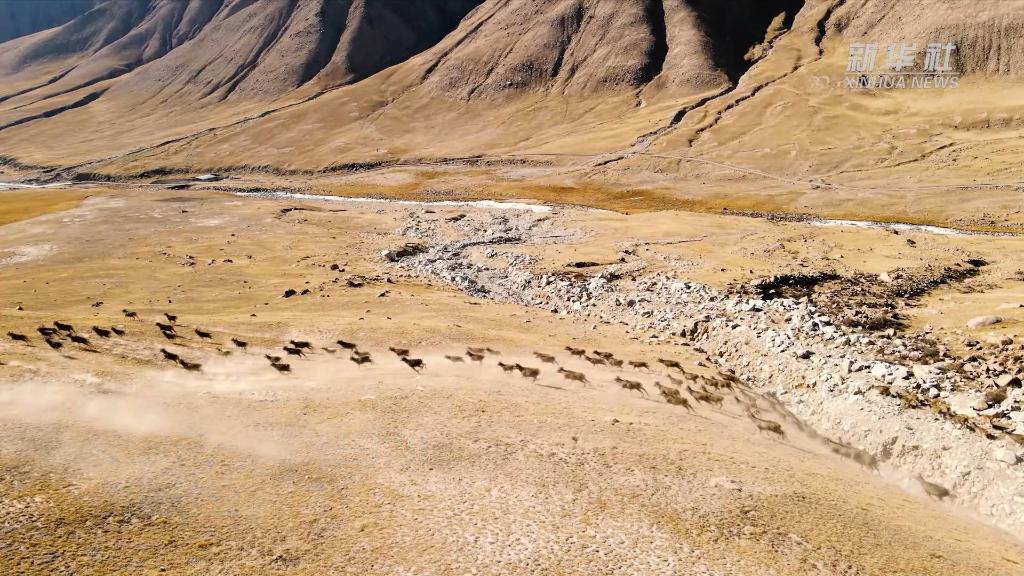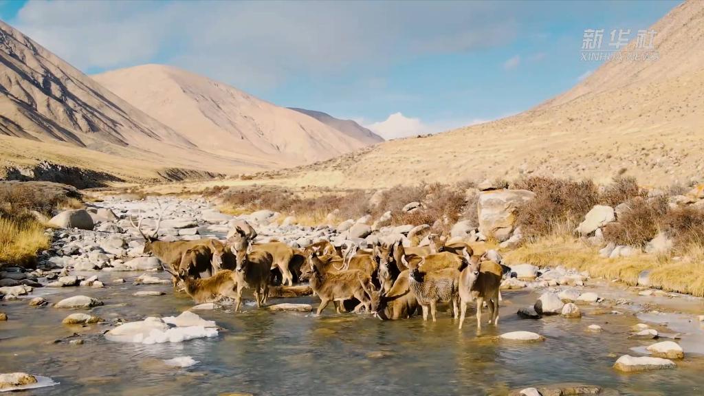 近日,在青海省海西蒙古族藏族自治州德令哈市柏樹山景區,上百只白唇鹿現身山澗,奔跑嬉戲。