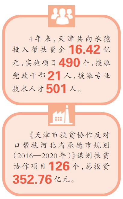 在東西部扶貧協作背景下,天津與承德攜手,共同編制實施《天津市扶貧協作及對口幫扶河北省承德市規劃(2016—2020年)》,謀劃扶貧協作項目126個,總投資352.76億元。