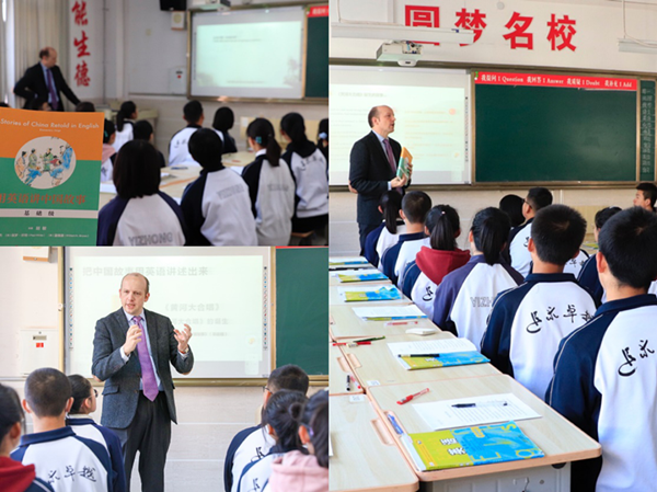 《用英語(yǔ)講中國(guó)故事大課堂》領(lǐng)銜主講斯明誠(chéng)(Symington)在宜川中學(xué)與學(xué)生交流。
