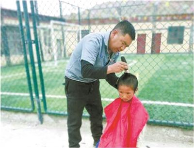 才旦多吉給學(xué)生理發(fā)。