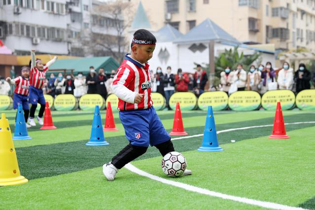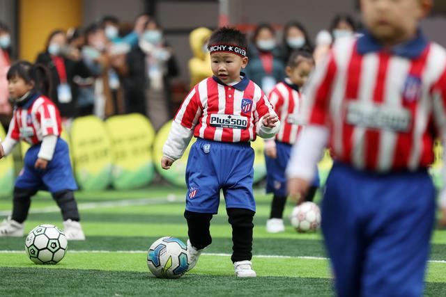 12月7日,淮北市第二實驗幼兒園的小朋友在足球課上學(xué)習(xí)踢足球。