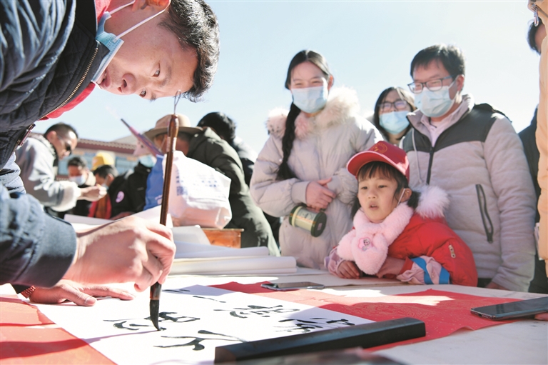 書法家現(xiàn)場揮毫潑墨,為群眾寫下祝福的文字。