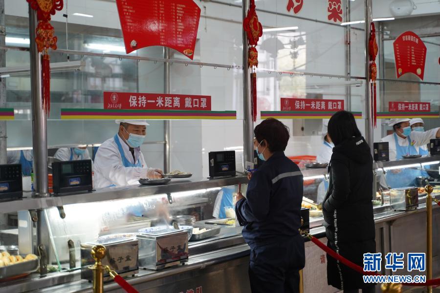 2月8日,北京交通大學學生四食堂工作人員為留校人員打飯。新華社記者 張浩波 攝
