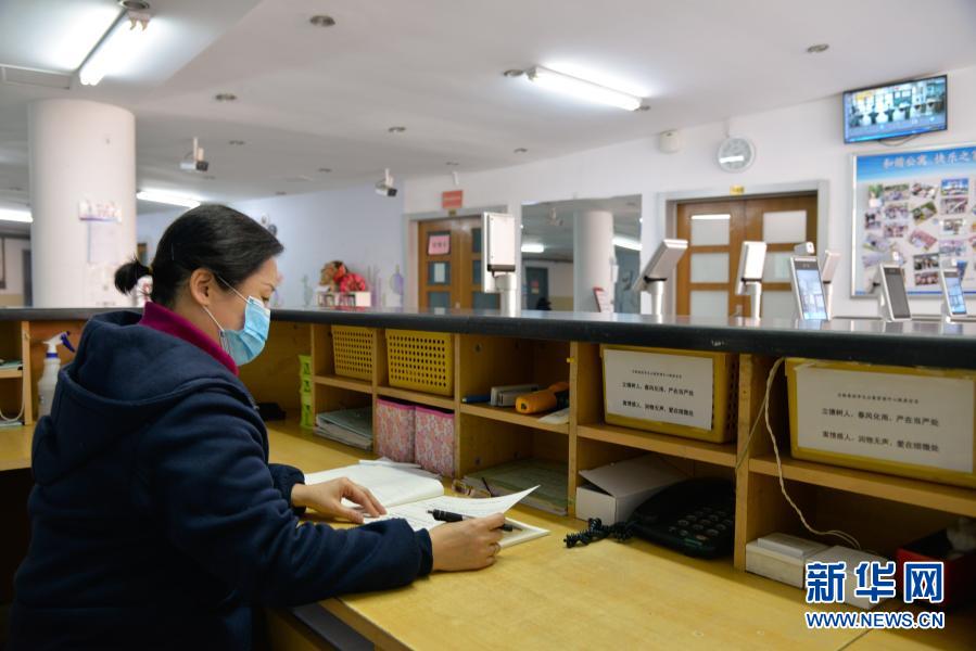 2月8日,北京交通大學學生公寓中心值班員李立在22號公寓大廳查看值班記錄。新華社記者 徐欽 攝