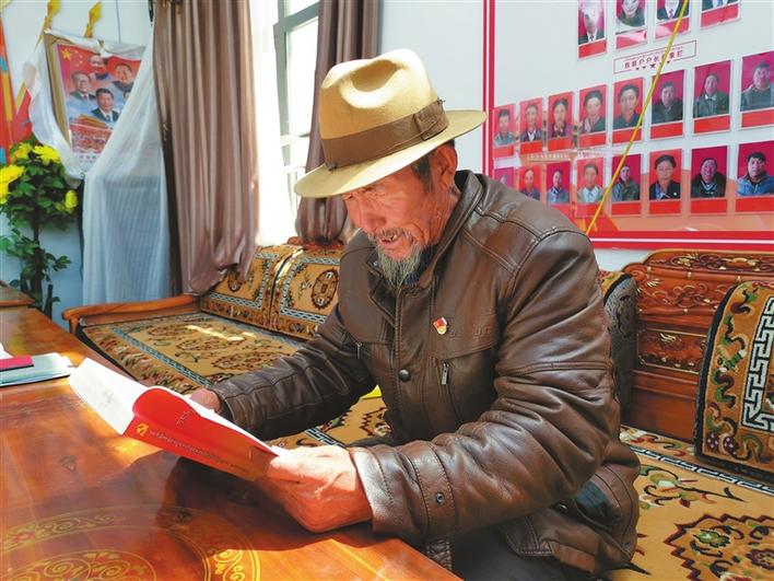圖為拉孜縣錫欽鄉錫欽村老人阿旺仁增正在閱讀學習。記者 扎西頓珠 攝