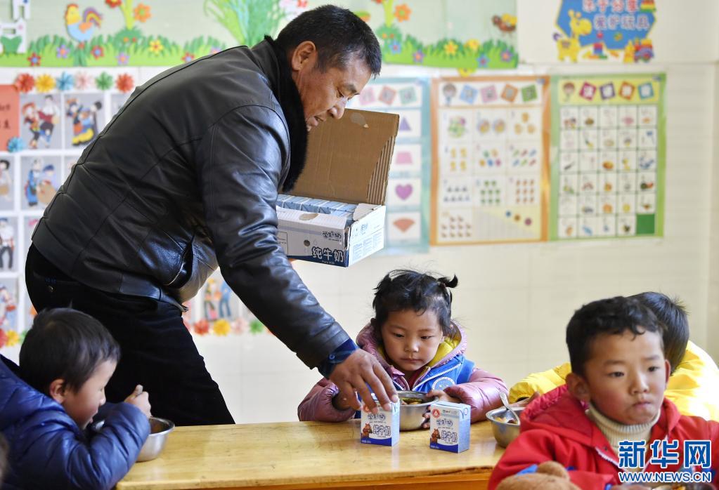 山南市貢嘎縣吉雄鎮紅星社區雙語幼兒園的老師正在為孩子們分發牛奶(2020年11月25日攝)。 新華社記者 張汝鋒 攝