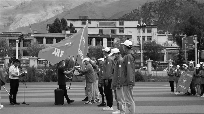 共青團西藏自治區委員會副書記何華向各市地志愿者隊伍授旗。圖由團區委提供