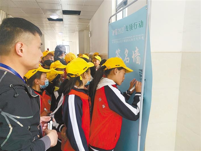 學(xué)生在“護(hù)苗2021”專項(xiàng)行動簽名墻上簽名。記者 張宇 攝