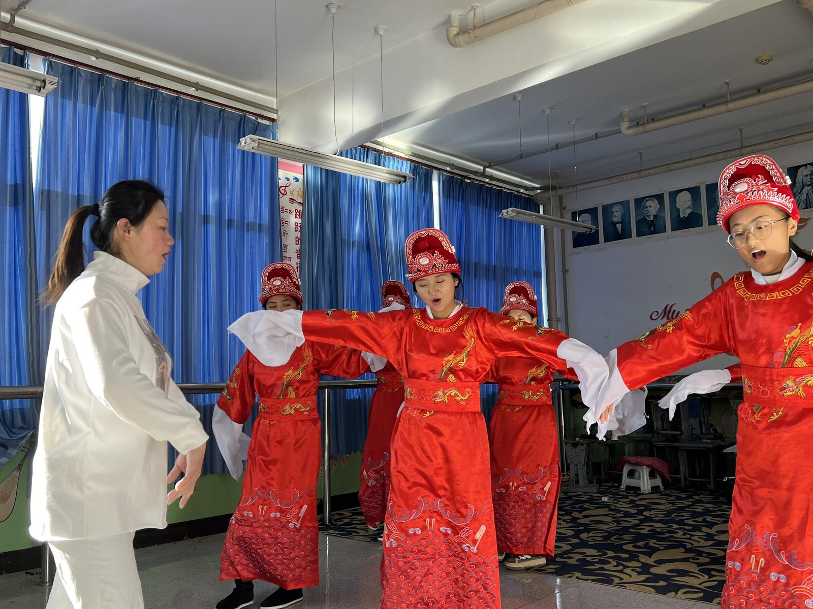 圖為老師正在指導學生黃梅戲的動作要領。