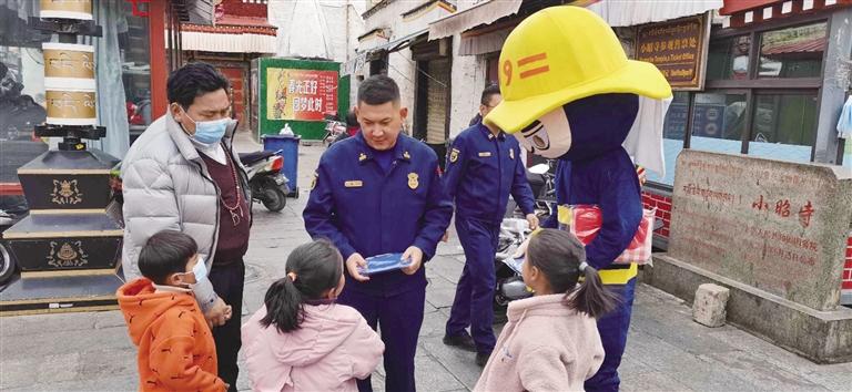 消防人員給小朋友發放“消防小禮品”。記者 旦增貢嘎 攝