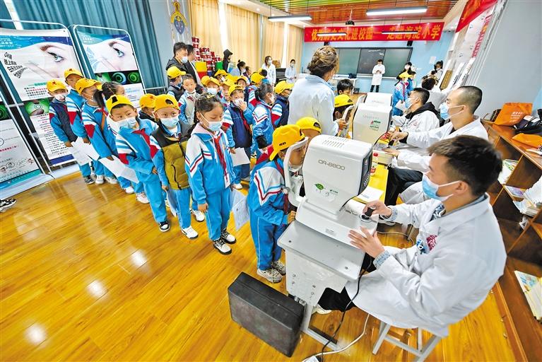 圖為醫(yī)護(hù)人員利用專業(yè)儀器為學(xué)生開展視力檢查。記者 唐斌 攝