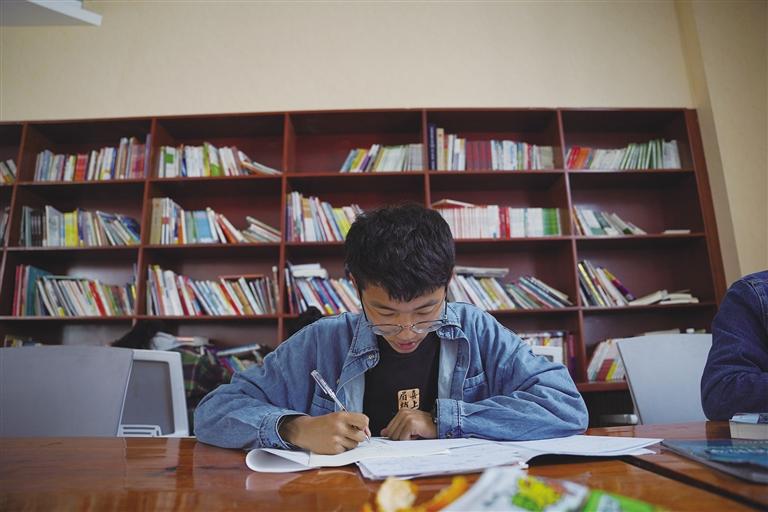 除了教室,閱覽室也是學(xué)習(xí)的好地方。在閱覽室,不少同學(xué)正奮筆疾書,只聽得見書頁翻動和筆尖書寫的“沙沙”聲。陽光透過玻璃傾瀉在書桌上,暖暖地照在這些青春的面龐,把他們點(diǎn)綴成五月里最美的風(fēng)景。閱覽室的最里邊,一位老師正在認(rèn)真講解試卷上的難題,不一會兒同學(xué)們就露出了恍然大悟的表情。“我很喜歡來閱覽室學(xué)習(xí),這兒比教室更安靜些,可以讓我靜下心來做題。”學(xué)生扎西江村說。