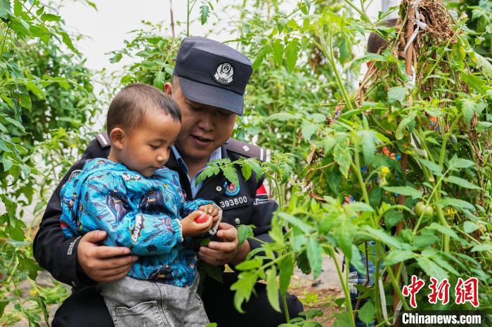 圖為亞東出入境邊防檢查站民警與龐達村雙語幼兒園小朋友共同采摘成熟了的西紅柿。 李錦輝 攝