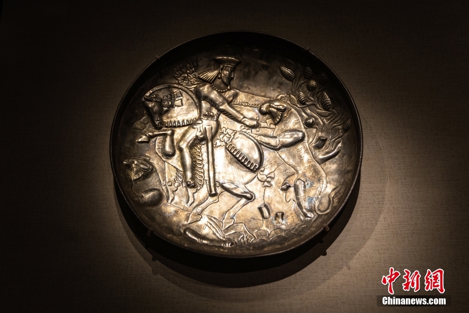 8月18日,甘肅省敦煌市,“燦爛記憶:從美索不達米亞到犍陀羅——東方文明古國冶金術展”在敦煌莫高窟揭幕。此次展覽是敦煌研究院與日本平山郁夫絲綢之路美術館近年第三次合作,展覽共展出從地中海沿岸,到中亞絲綢之路沿線國家的金屬類文物221組件、絲路錢幣33枚,時間跨度長達4000多年、范圍遍及歐亞大陸的絲綢之路上各大文明區域冶金術的變化圖景。圖為參展展品帝王狩獵紋盤。 中新社發 王嘉奇 攝