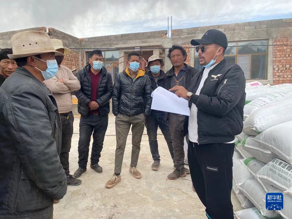 2021年4月13日,拉東才索南(右一)正給農民發放黑青稞種子。(受訪者供圖)