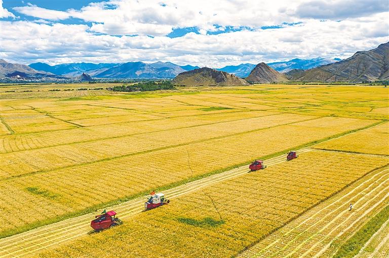 努力把資源優(yōu)勢(shì)轉(zhuǎn)化為發(fā)展優(yōu)勢(shì),做大做強(qiáng)高原特色產(chǎn)業(yè),加快構(gòu)建現(xiàn)代產(chǎn)業(yè)體系。2012年至2021年,城鎮(zhèn)居民和農(nóng)村居民人均可支配收入分別從18362元、5698元增長(zhǎng)至46503元、16932元。圖為西藏自治區(qū)江孜縣紫金鄉(xiāng)青稞種植喜獲豐收。