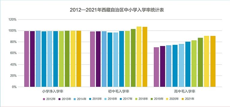 教育事業(yè)成果豐碩。全區(qū)共有各級(jí)各類學(xué)校3339所,在校學(xué)生92萬(wàn)人。圖為西藏自治區(qū)中小學(xué)入學(xué)率統(tǒng)計(jì)表。