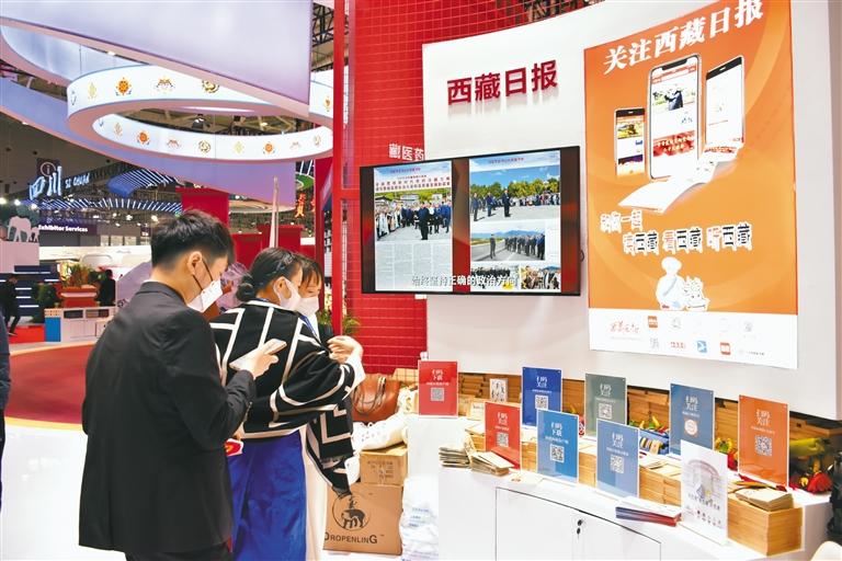 圖為參觀者在西藏傳媒集團有限公司展位前了解產品詳情。記者 謝筱純 攝