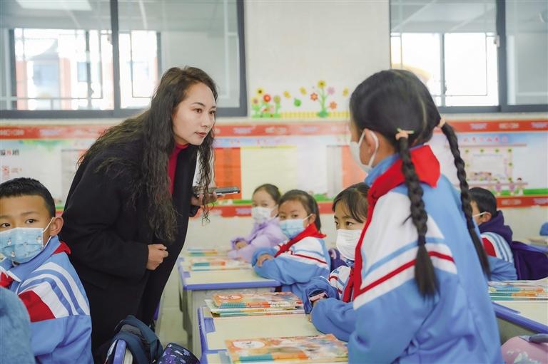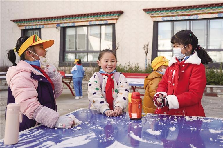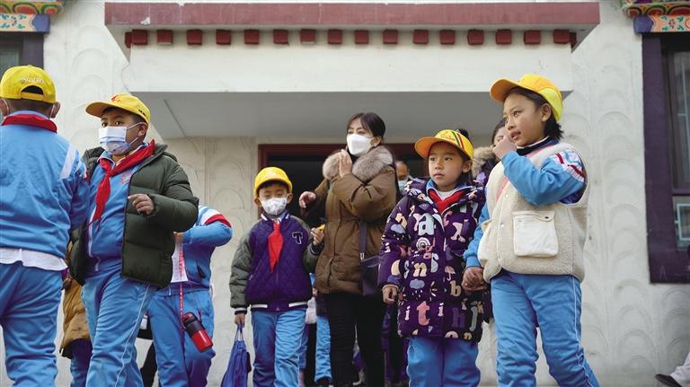 除了激動的家長,學生們的心情也很激動。在校門口,扎西旺扎和索朗培塔大老遠就認出了對方,倆人快速跑向對方,雖然戴著口罩,眼里卻充滿笑意?!案袅四敲淳媒K于見面了,太激動了,很想念我的好朋友?!痹魍χf。你假期看了什么動畫片、又新學了什么東西、去哪里玩了、作業完成得如何……太久沒見了,小伙伴們再次見面,分外親熱,大家一起嬉笑打鬧著進入校園。