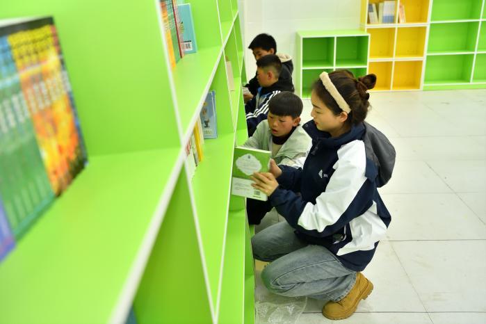 藥山鎮中心小學的同學們在新閱讀室閱讀新書。