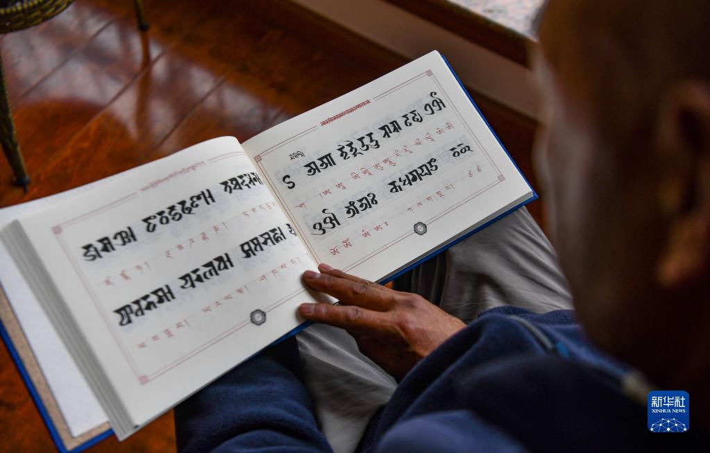 久米次成查閱梵文藏文對(duì)照工具書(4月19日攝)。新華社記者 晉美多吉 攝