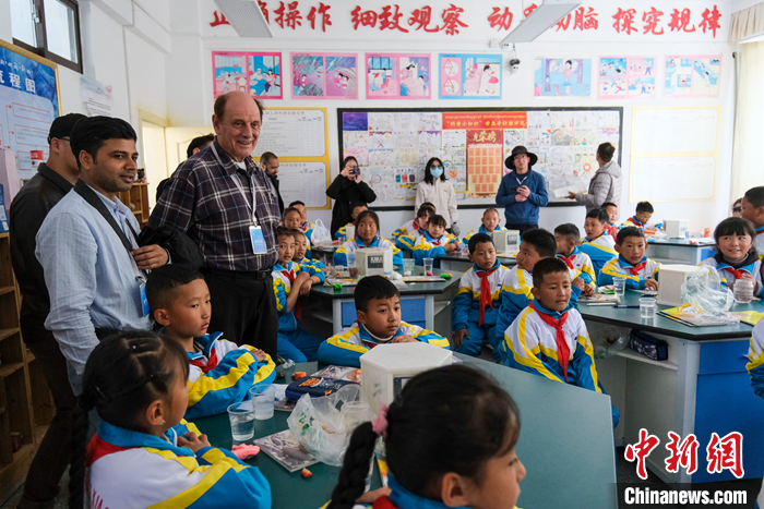 圖為5月18日上午,參訪團成員在林芝市第二小學觀看孩子們上實驗課。 中新社記者 江飛波 攝