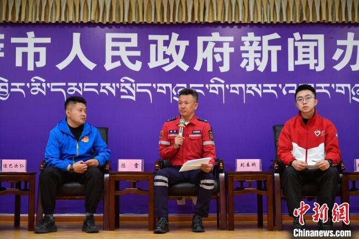 圖為拉薩市青年志愿救援隊代表陳雷(中)正在分享志愿服務經歷。 貢嘎來松 攝