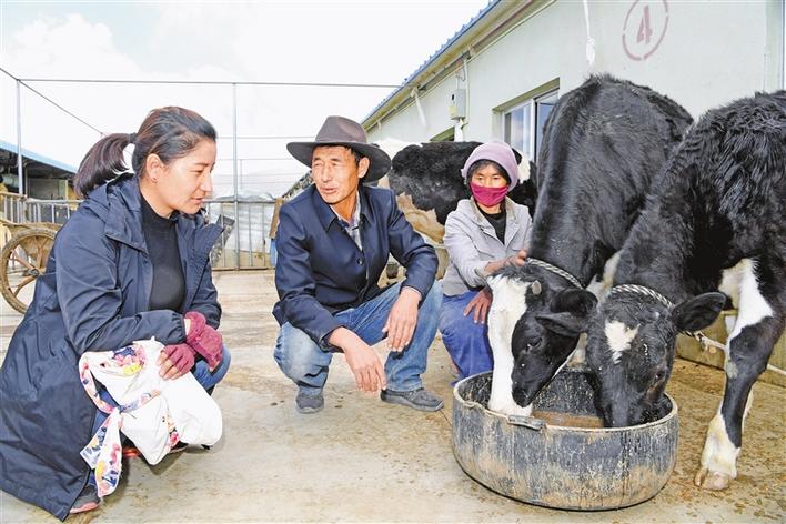 圖為合作社致富帶頭人多布杰(中)在牛場(chǎng)內(nèi)查看奶牛飼養(yǎng)情況。記者 李洲 次旺 攝