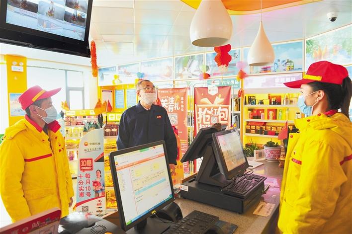 圖為葛立均(中)在考察中石油阿里銷售分公司加油站過程中走訪慰問干部職工。 記者 溫凱 洛桑旦增 攝