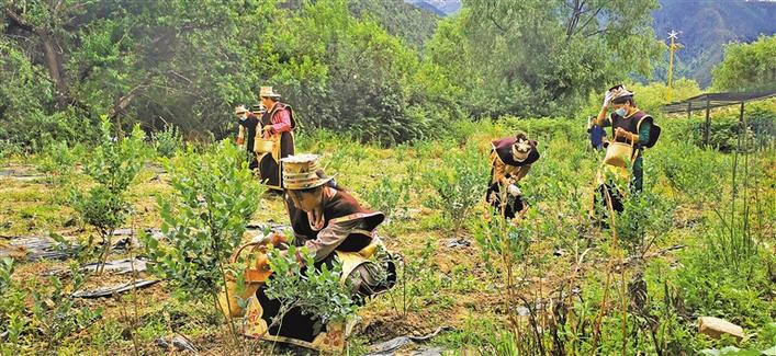 來到藍莓示范種植基地,只見約一米高的藍莓樹上,成串的藍莓綴滿枝頭。熟透的藍莓上,覆蓋著一層果霜,透出微微的藍紫,看得人垂涎欲滴;還有一些顏色稍淺、或表皮尚青的果實,在吸收充足的陽光后也將成熟,從酸味變得越來越甜。從卡達村前來務(wù)工的7名婦女手提籃子穿梭在低矮樹叢中進行采摘,好不愜意。