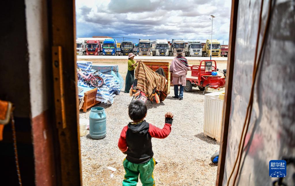 運輸家具的貨車在雙湖縣多瑪鄉果根擦曲村集合(7月12日攝,無人機照片)。新華社記者 孫非 攝